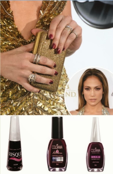 E para combinar com o vestido dourado da Jennifer Lopez, unhas vermelhas num tom escuro, fechado.