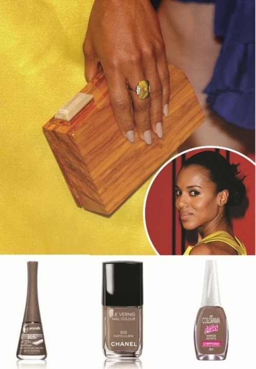 Kerry Washington combinou seu vestido amarelo com unhas na cor taupe. Chique!