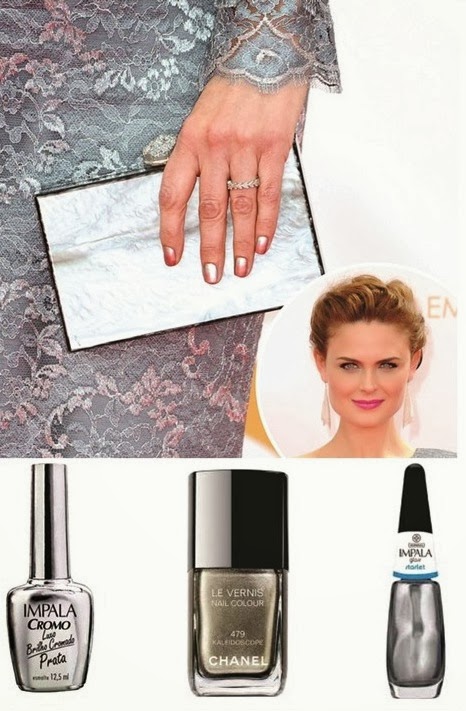 Emily Deschanel optou pelo esmalte metálico para usar com seu vestido de renda azul. Gosto da opção, mas tem que tomar cuidado para o esmalte não ficar excessivamente brilhando, sobretudo nas morenas.