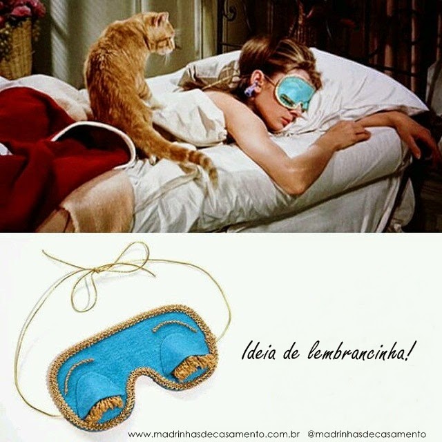 Outra lembrancinha que acho que ficaria bacana é uma máscara para dormir ( para tapar os olhos). A personagem de AUDREY HEPBURN no filme usava uma toda diferente. Dá para comprar máscaras inspiradas no filme no Elo 7 e Mercado Livre. Dá para tentar fazer em casa ou então comprar uma simples mesmo e colocar data e o nome da noiva.
