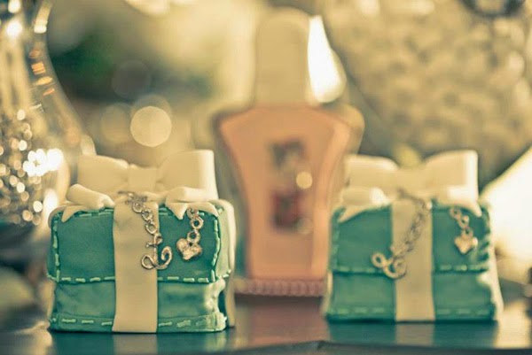 A cartela de cores da festa inclui branco, preto e muito azul Tiffany. É importante não fugir destas cores para não comprometer a unidade visual da festa. Óculos gatinho, pérolas, laços, e tudo que remete a muita feminilidade fazem parte do universo de Bonequinha de Luxo. Se observar as fotos abaixo perceberá que é uma festa fácil de fazer, que não requer a compra de itens muito diferentes.