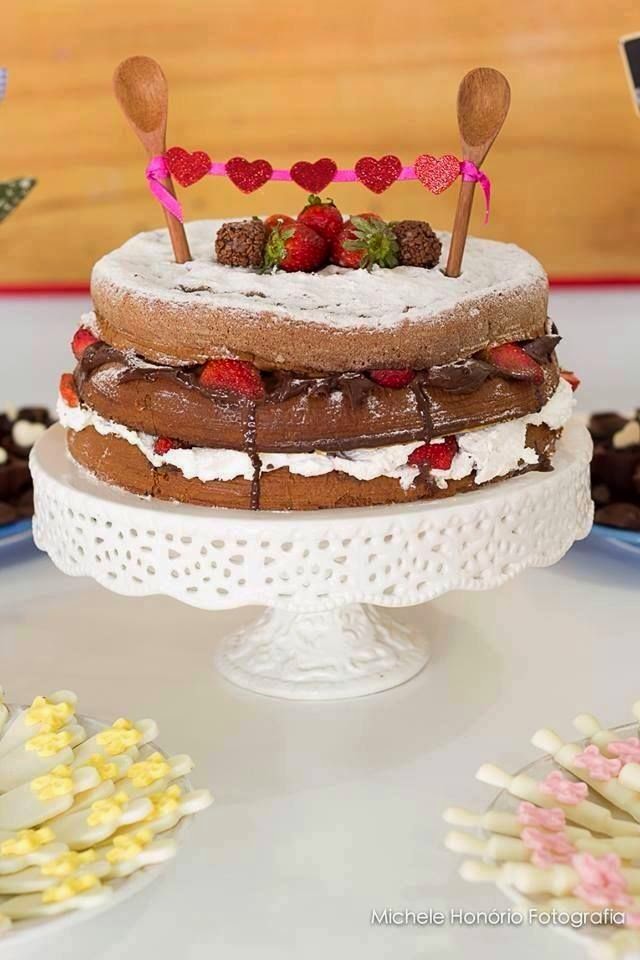 5- Quer se aventurar a fazer o bolo mas não sabe confeitar/ Se joga no naked cake ( bolo pelado) e enfeita com açúcar de confeiteiro, colher de pau , fitinha e coraçãozinho. Ou se o chá for de lingerie basta substituir a colher de pau por outra base ( talvez canudo de papel).