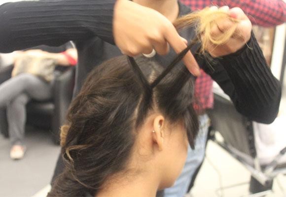 Depois divida todo cabelo (menos a franja) em três partes