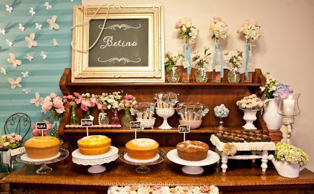 Ou usar um bolo comum, servido num prato alto bonito e com um pouquinho de açúcar de confeiteiro peneirado por cima. As plaquinhas tipo lousa ajudam a dar um charme a mais.