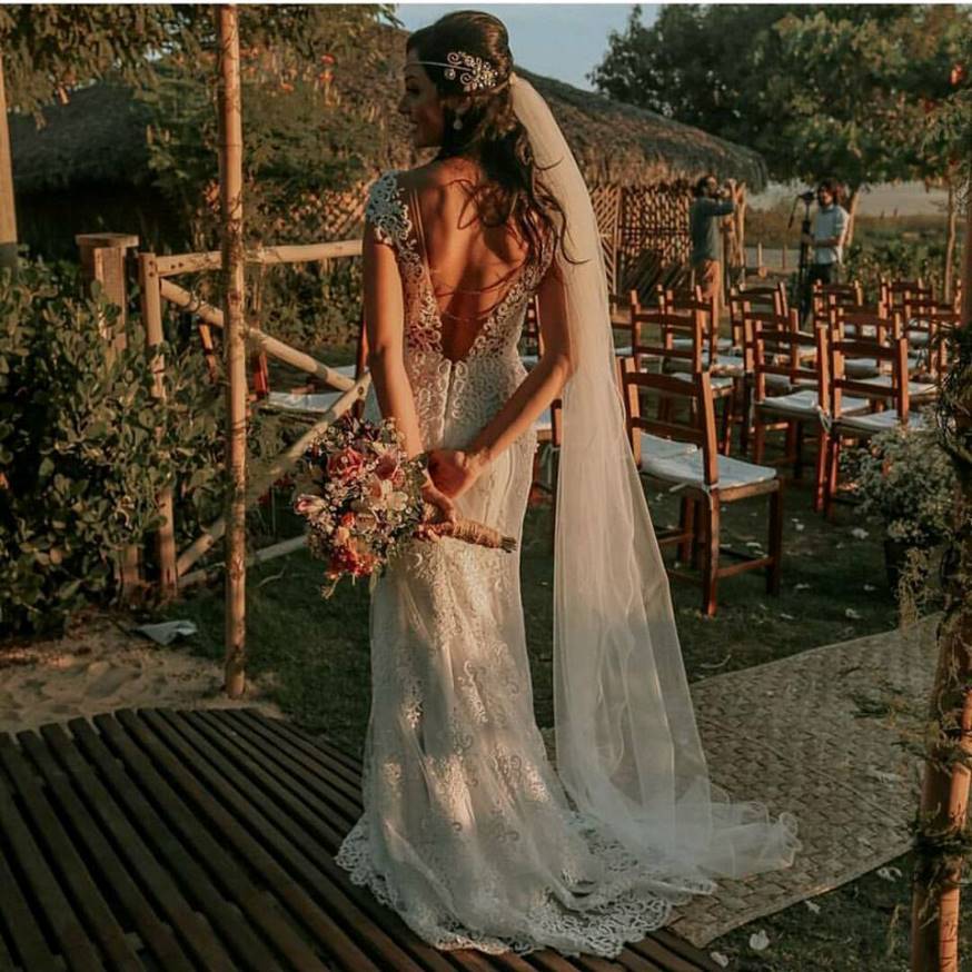 Vestido de noiva rendado super combina com casamentos ar livre.