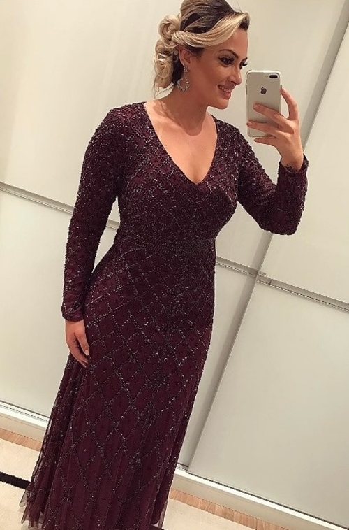 Este é um tom de vinho mais escuro, porém entrou no post pois é uma opção com manga. Aluga na Alugue Vestidos, contato no 67-99284-4488.