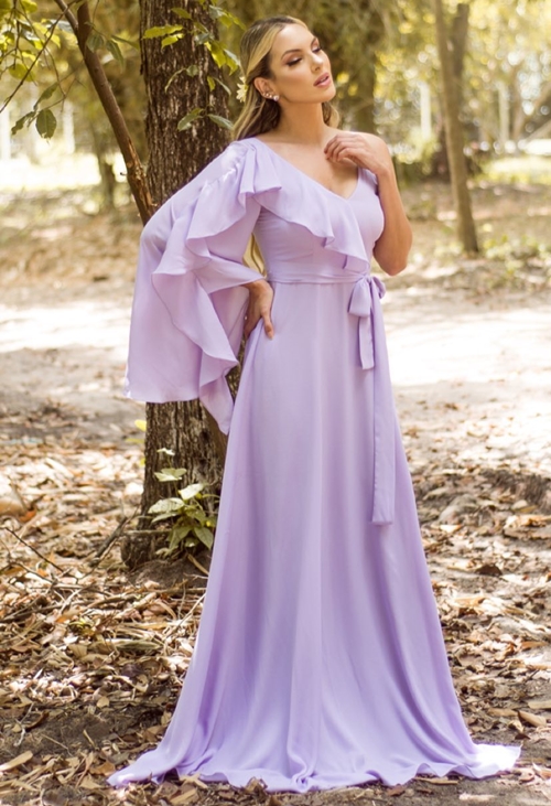 01-Vestido lavanda (outra tendência para madrinhas) com uma manga longa. Levíssimo! À venda na loja Maison Look, contato no (83) 98608-1008.