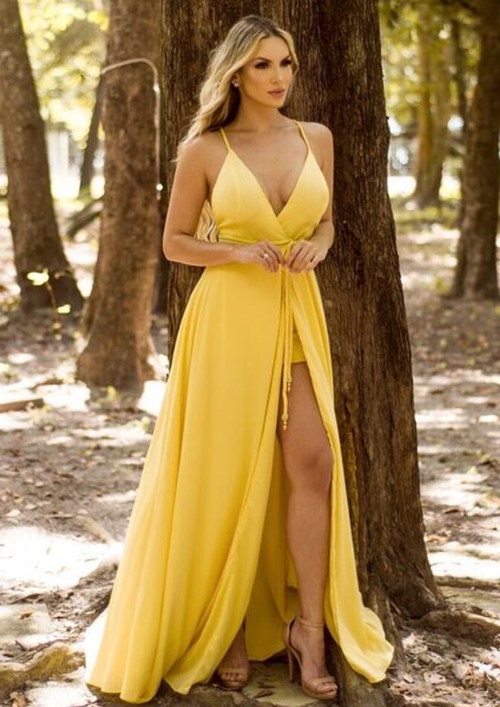 05-Vestido amarelo andou meio sumido mas devagarzinho está voltando à moda festa. Este vestido além de esvoaçante tem uma super fenda. Para não correr riscos vem com um shortinho (hot pant) por baixo. À venda na Loja Look, contato no (83) 98608-1008.
