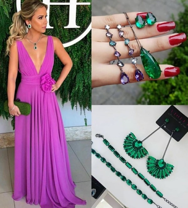 Para não ter como errar na escolha das cores de acessórios para usar com o vestido de festa o ideal é que as combinações fiquem em composições monocromáticas (tom sobre tom) ou o grande sucesso do momento, acessórios (brinco, colar, anel) com pedras em tons de verde (esmeralda, turmalina, ródio).